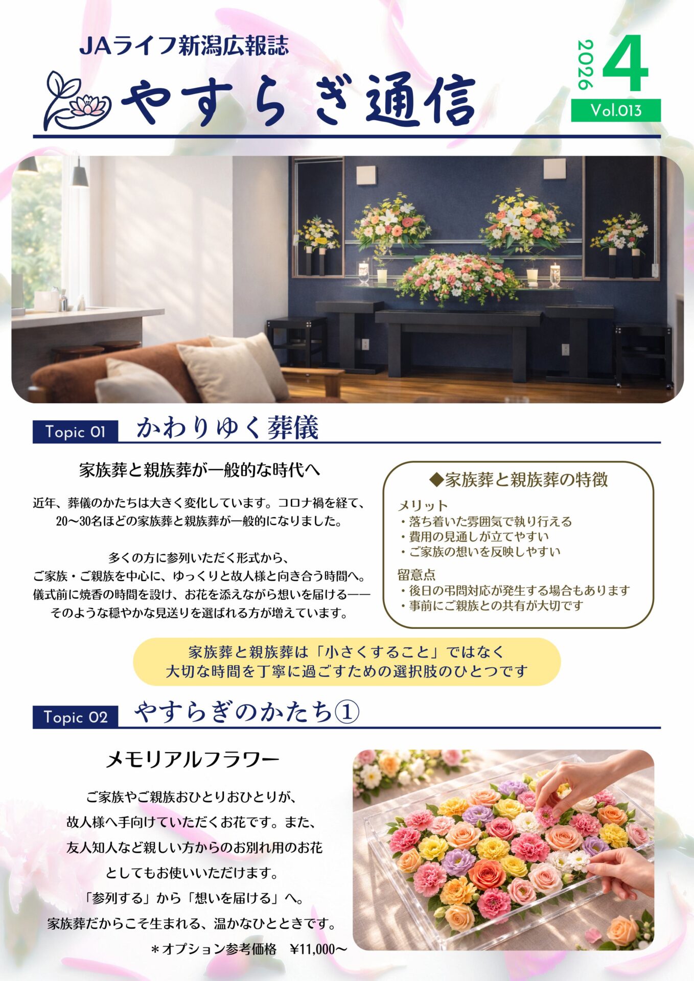 私たち株式会社JAライフ新潟は、創業以来”親切、真心を込めた葬祭のお手伝い”をモットーに、御家族様の慈しみの心を常に考え、尊敬と親愛の情を込めてご遺族が思い出に残る儀式のご提案ができるよう社員全員で努力し、地域の皆様から日頃よりご支援頂いております。